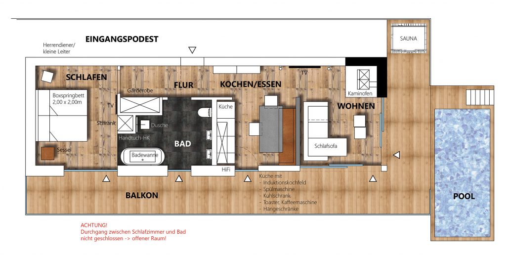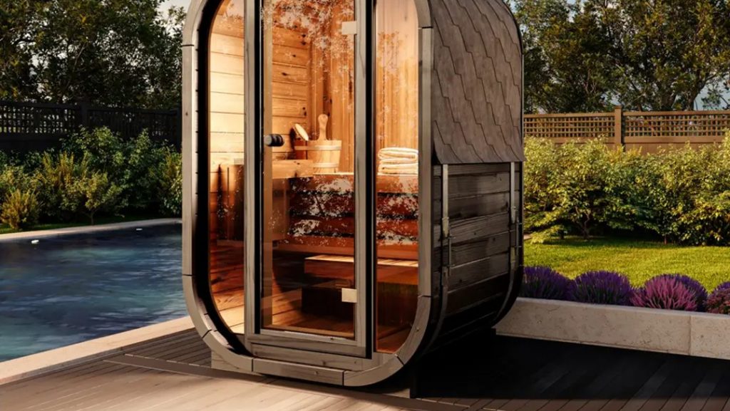 Die Fasssauna bietet Platz für bis zu zwei Personen und ist somit ideal für intime Momente zu zweit. Ihr Standort direkt angrenzend an das Wohnzimmer ermöglicht einen nahtlosen Übergang zwischen der wohltuenden Wärme der Sauna und der Entspannung im Freien.